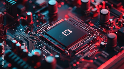 Close-up of a CPU Chip on a Motherboard with Red Lighting