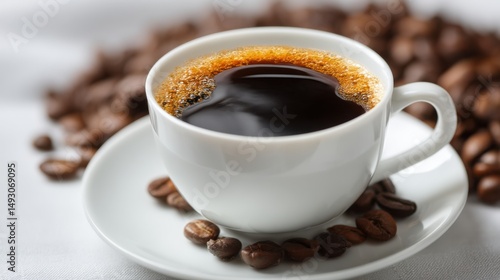 Close-up of a cup of black coffee on a saucer surrounded by coffee beans on a white tablecloth in a studio setting
