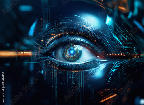 Close-up of a cybernetic eye, detailed with a grainy paper texture. Glowing circuits encircle the realistic pupil, creating a futuristic, technological feel.