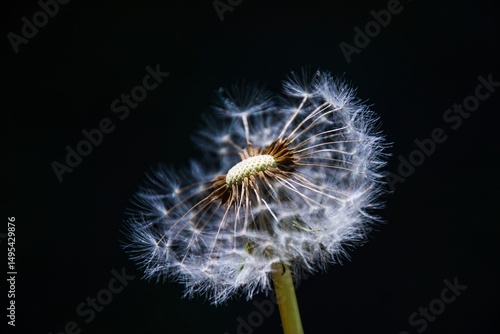 Close-up of a dandelion seed head on a black background, macro. Ideal for nature-themed designs, wellness concepts, backgrounds, or inspirational content.
