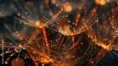 Close-up of a dandelion with glistening dew drops exposed to soft, warm sunlight
