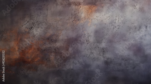 Closeup of a dark gray textured concrete wall with splashes of orange paint.