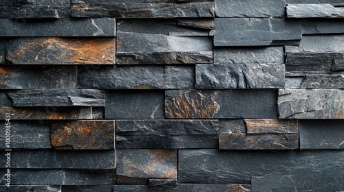 Close-up of a dark grey stone wall, with some rusty tones on some stones.