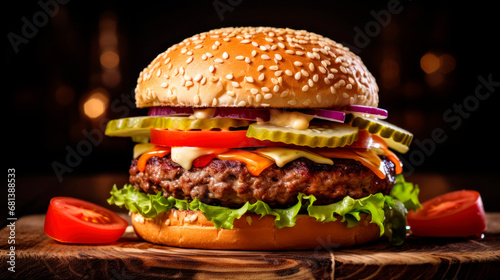 Close-up of a delicious hamburger on a wooden table. AI generated.