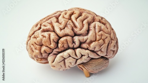 Close-up of a detailed human brain model with natural wrinkles and fading colors, representing the aging process, placed on a clean white background with ample space for text. Concept of neuroscience