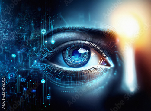 Close-up of a digital eye, rendered with a grainy paper texture. The iris displays intricate circuitry, blending technology with human anatomy. Blue and gold hues dominate.