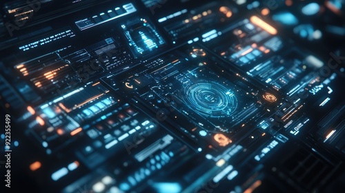 Close-up of a digital interface with futuristic elements and floating data points.