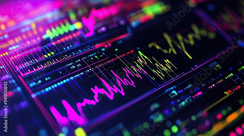 Close-up of a digital oscilloscope screen displaying vibrant electrical waveforms and signal patterns