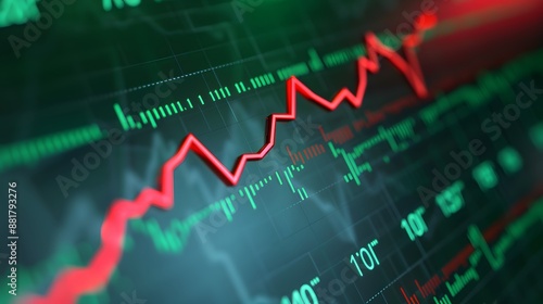 Close-up of a digital stock market ticker showing fluctuating prices with a red downward trend line on a green background. Abstract blur background.