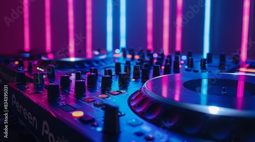Close-up of a DJ booth with neon lights background wallpaper night club