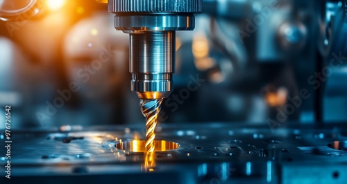 Close-up of a drill bit cutting into a metal surface, showing the precision and power of modern manufacturing.