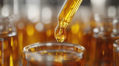 Close-up of a dropper releasing golden liquid into a clear glass jar, showcasing a laboratory setting