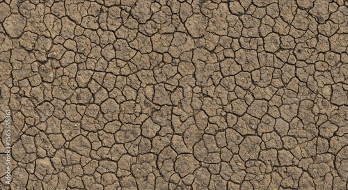 Closeup of a dry parched earth surface with a dense network of irregular polygonal cracks in light brown and tan hues