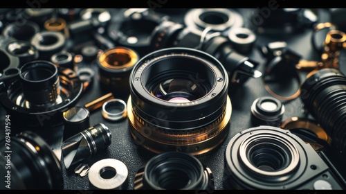 Closeup of a DSLR lens disassembled to show the complexity and beauty of its lens elements