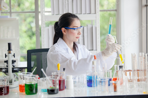 Closeup of a female scientist filling test tubes with pipette in laboratory science laboratory research and development concept