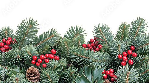 Close-up of a festive evergreen garland with red berries and pine cones, perfect for holiday decorations.