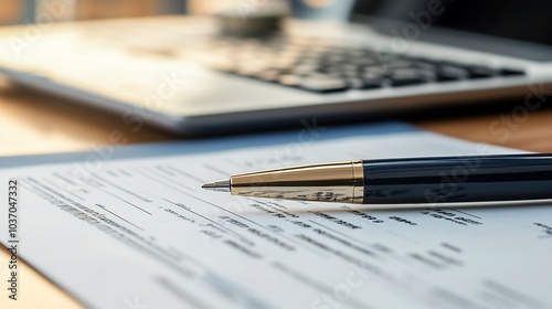 Closeup of a financial document with signatures and details of a real estate deal with a pen calculator and a laptop showing property data on the desk