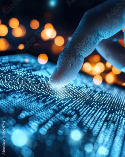 Close-up of a Finger Touching a Digital Screen with Abstract Data Visualization and Glowing Lights in Background