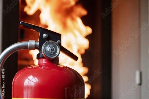 Close-up of a fire extinguisher in the house with a fire burning in the background. Fire safety concept