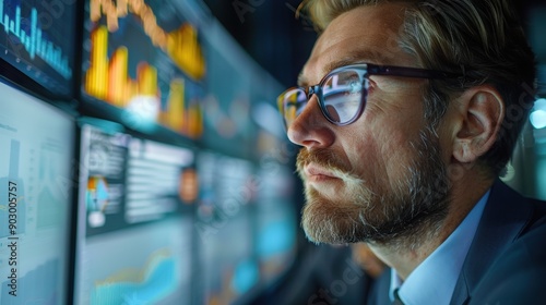 Close-up of a focused analyst examining stock market data on multiple screens, reflecting real-time financial information and trends.