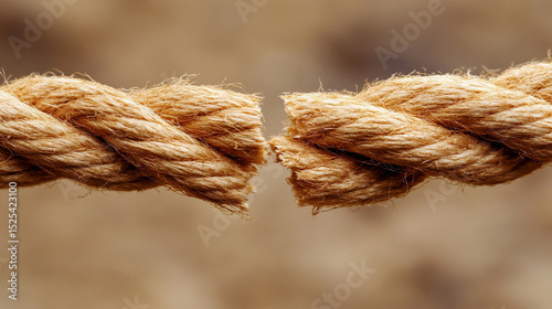 Close-up of a fraying rope breaking at its midpoint against a bright white blurred background. Minimalistic composition symbolizes conflict, tension, division, struggle, resilience, and the breaking p
