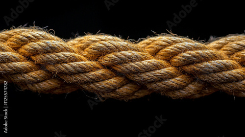 close-up of a fraying rope breaking in the middle, held tightly by two opposing hands. Symbolizes conflict, tension, division, struggle, resilience, or the breaking point in relationships