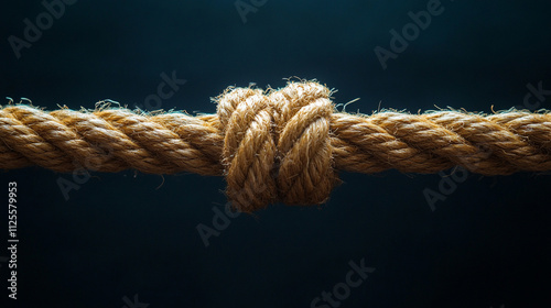 close-up of a fraying rope breaking in the middle, held tightly by two opposing hands. Symbolizes conflict, tension, division, struggle, resilience, or the breaking point in relationships