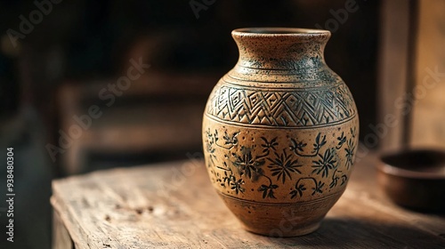 Close-up of a freshly crafted ceramic vase resting on a wooden table, showcasing intricate patterns and textures