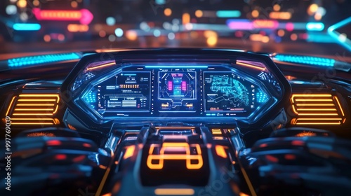 Close-up of a futuristic car dashboard featuring a digital interface with holographic displays and advanced controls