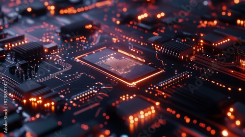 Close-up of a futuristic circuit board with a clean, illuminated background and complex circuitry