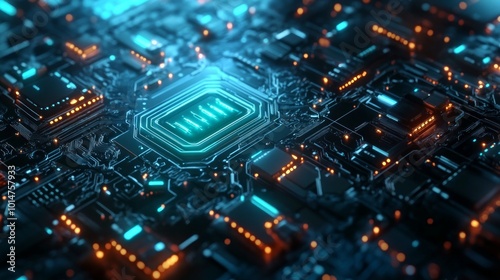 Close-up of a futuristic circuit board with a glowing central processor unit.