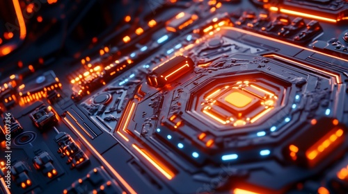 Close-up of a futuristic circuit board with glowing orange and blue lines, intricate design, and central processor.