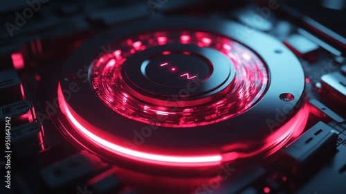 Close-up of a futuristic device with glowing red lights and intricate design, perfect for technology and innovation concepts.