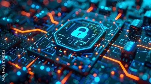 Close-up of a futuristic digital circuit board with a glowing padlock symbol, representing cybersecurity and data protection.