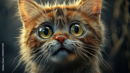 Close-up of a ginger cat with wide eyes and a surprised expression