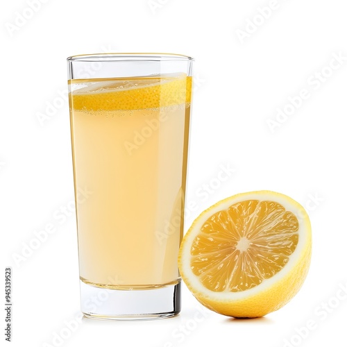 Closeup of a glass filled with clear vibrant lemon juice set against a plain white background for a clean minimalist look The beverage appears fresh inviting