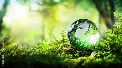 Close-up of a glass globe nestled in green moss under the canopy of a vibrant forest, representing a green companyaes commitment to sustainability and planet care