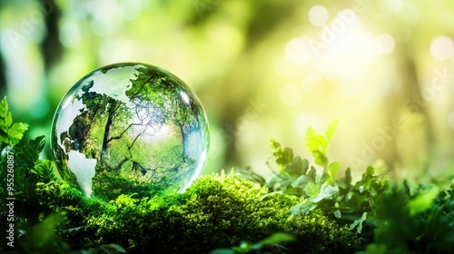 Close-up of a glass globe nestled in green moss under the canopy of a vibrant forest, representing a green companyaes commitment to sustainability and planet care