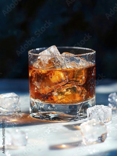 Close-up of a glass of whiskey with ice cubes in it. the glass is made of clear glass and is filled with a dark brown liquid, which appears to be whiskey.
