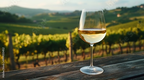 Closeup of a glass of white wine on a wooden table with green vineyards in the background Wine tasting rating and savoring : Generative AI