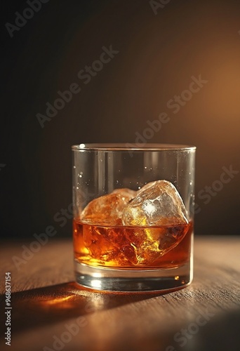 Close-up of a glass with whiskey and ice cubes on an aesthetic background, copy space on a side