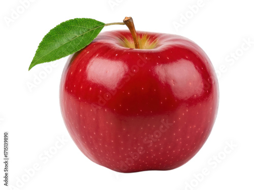 Close-up of a glossy red apple with a green leaf