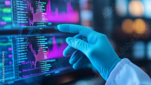 Close-up of a gloved hand interacting with a futuristic display displaying data trends and analytics in a lab environment.
