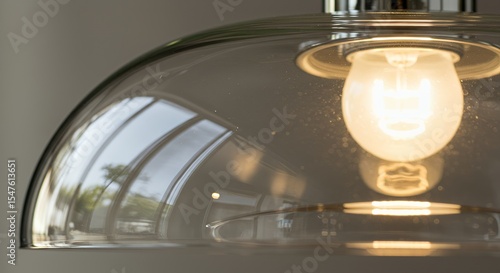 Close-up of a Glowing Glass Pendant Light Fixture with Visible Dust Particles