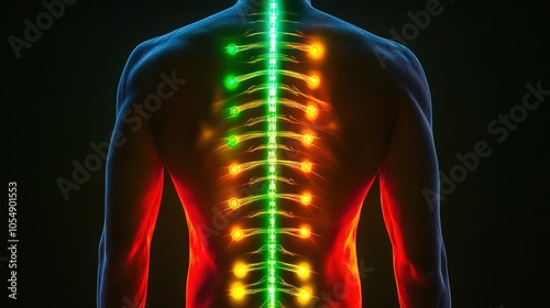 Close-up of a Glowing Human Torso with Aligned Chakras Along the Spine, Connected by Thin Beams of Light in Perfect Harmony