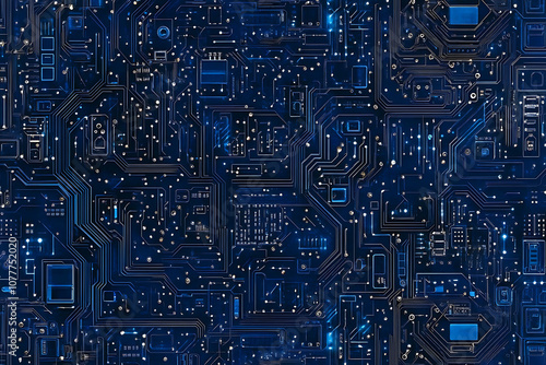 Close-up of a glowing neon circuit board pattern, showcasing intricate lines and electronic pathways in a vibrant blue hue