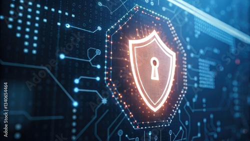 Close-up of a glowing shield icon on a digital screen, symbolizing cybersecurity and protection, with binary code and network connections in the background. Digital security and data protection