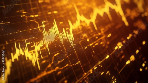 Close-up of a gold price chart on a digital screen with sharp upward trends and indicators.