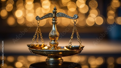 Close-up of a golden scale symbolizing justice, balanced against a blurred bokeh background, evoking law and fairness