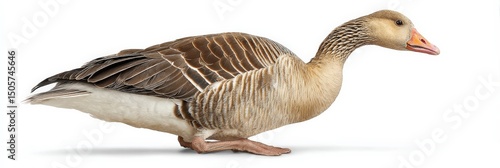 Close-up of a graceful goose, showcasing its intricate plumage and elegant posture against a stark white background.